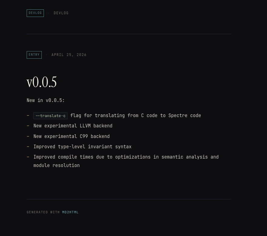 Spectre is a statically typed, contract-based programming language built for low-level control in combination with verifiably safe constructs. It has no garbage collector, and aims to deliver predictable performance.